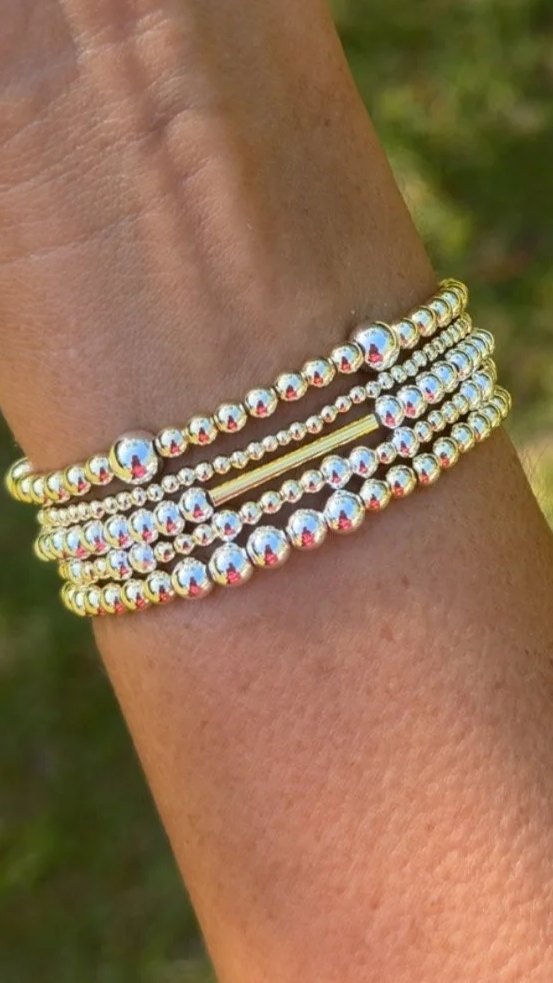 Bracelets are made with 14k gold-filled and silver-plated beads, offering durable shine and refined style at an accessible price point.